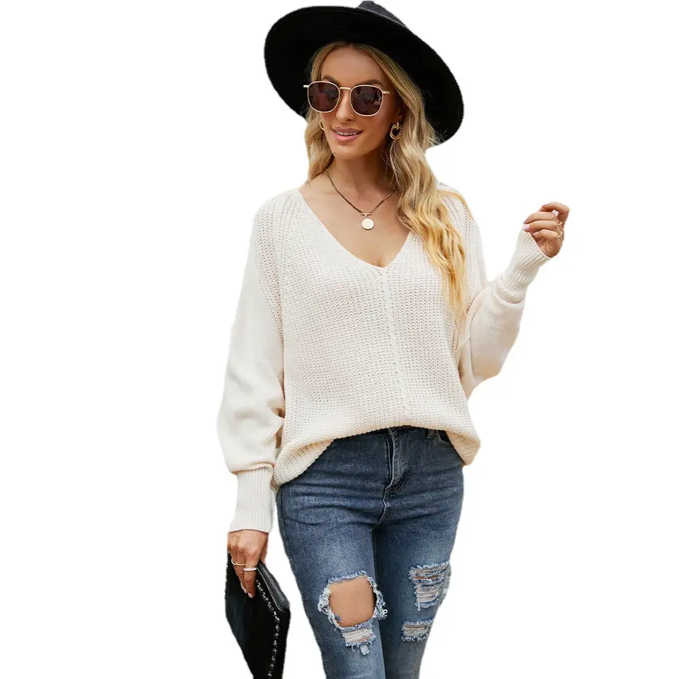 Women Autumn Winter Solid Color Batwing Sleeve Thick Knitting V-Neck Pullover Casual Sweater
