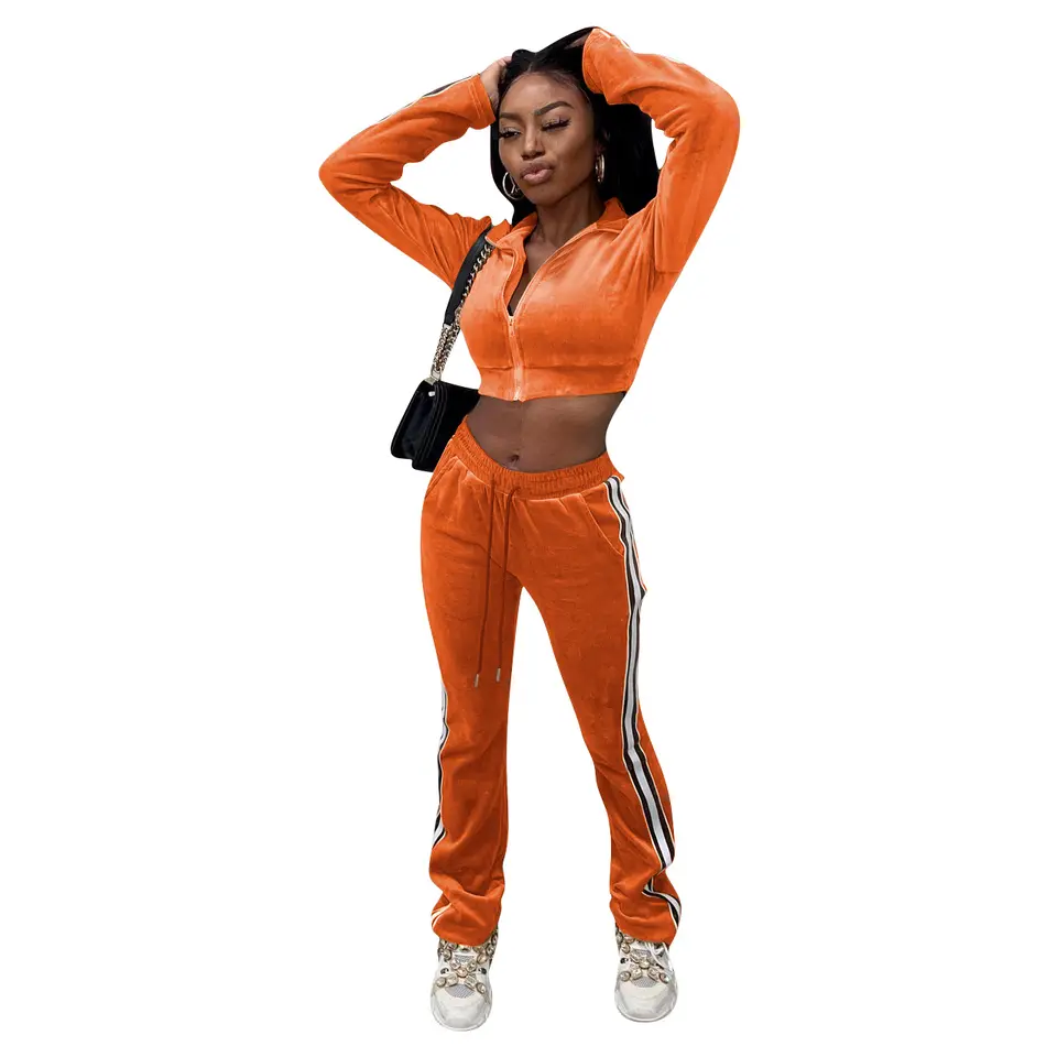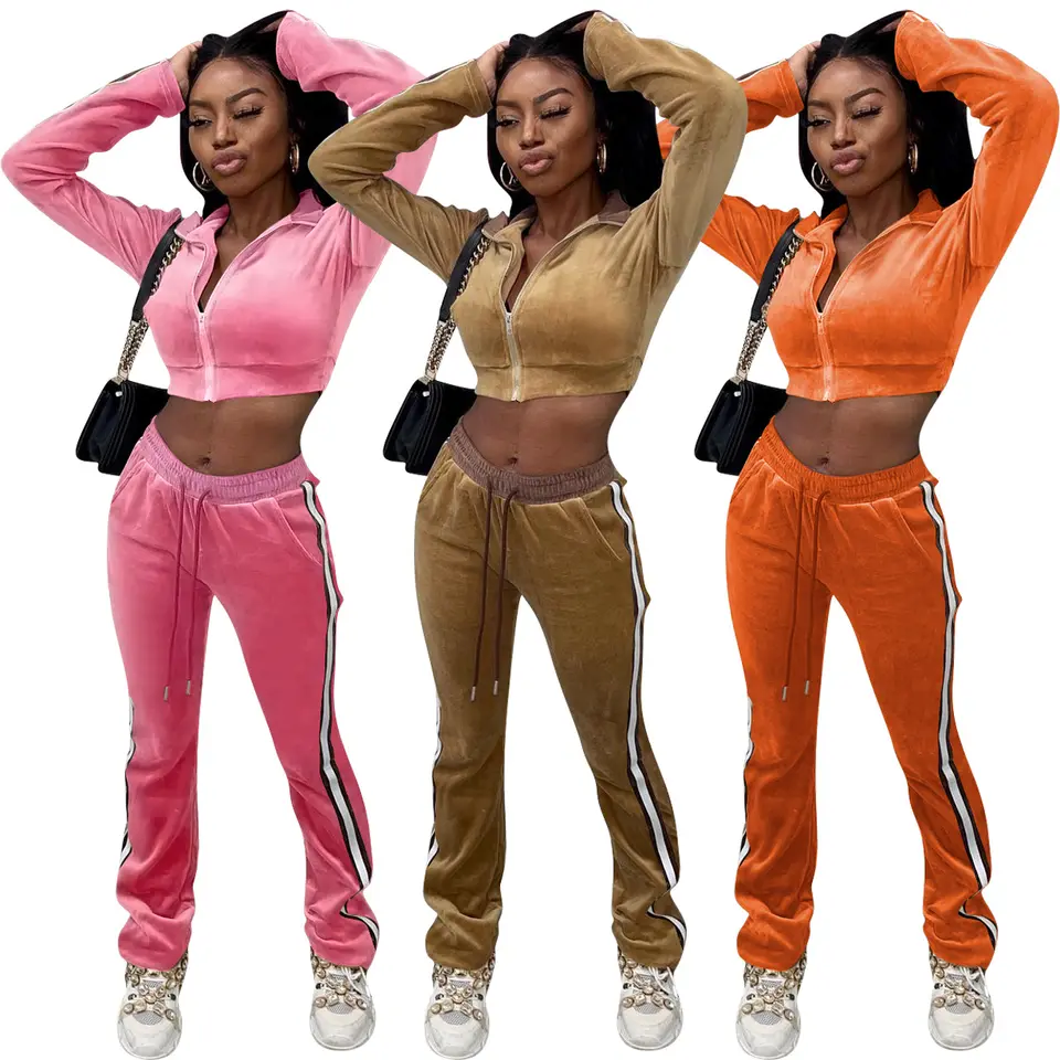 Women’s Velvet Tracksuit Fashion Crop Long Sleeve Jacket Pants Set Casual Two Piece Sweat Suit